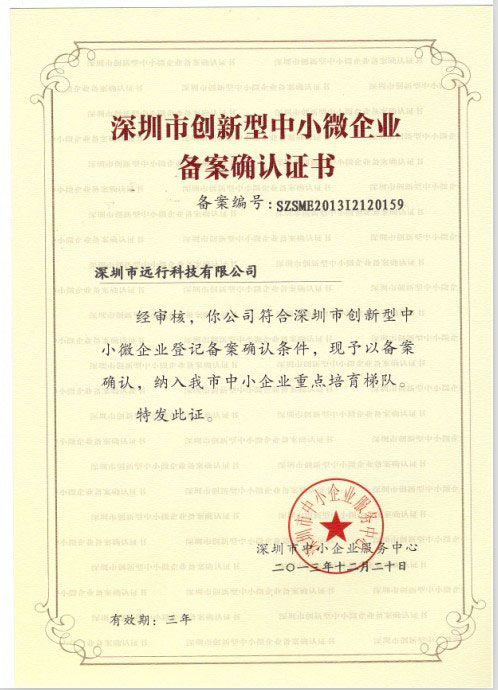 根據(jù)深圳市經(jīng)濟(jì)貿(mào)易和信息化委員會(huì)出臺(tái)的《深圳市中小企業(yè)創(chuàng)新幫扶行動(dòng)計(jì)劃實(shí)施方案》,深圳市中小企業(yè)服務(wù)中心組織對(duì)本市創(chuàng)新型中小微企業(yè)實(shí)行備案確認(rèn),經(jīng)審查評(píng)估,我司符合備案確認(rèn)條件,并頒發(fā)了備案確認(rèn)證書。