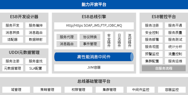 遠行ESB服務總線基于主流高性能消息中間件和規則引擎自主研發,包括ESB開發設計器,消息中間件和ESB總線引擎,服務全生命周期管理和能力開放平臺。