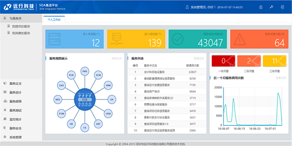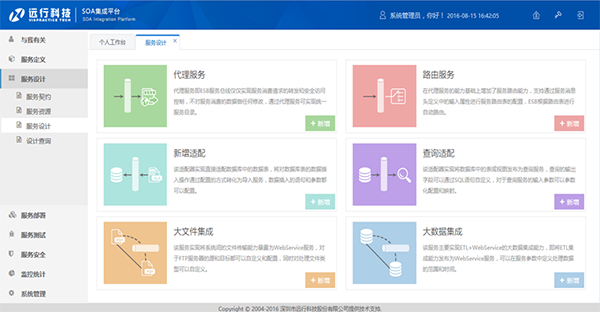 遠行ESB服務總線包括服務訂閱,服務設計,服務部署,服務測試,監控統計,服務安全多個功能模塊和子系統,覆蓋服務實施全生命周期管理流程。