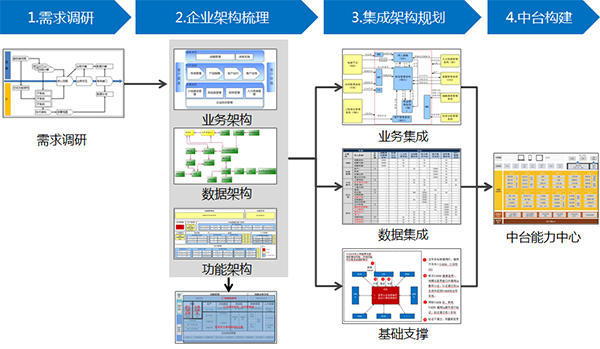 以SOA和企業架構規劃思想為核心指導,企業業務驅動IT的思路,進行企業業務流程,數據架構的梳理,拆分中臺給微服務模塊形成能力提供中心,并定義和識別開發API接口服務能力。